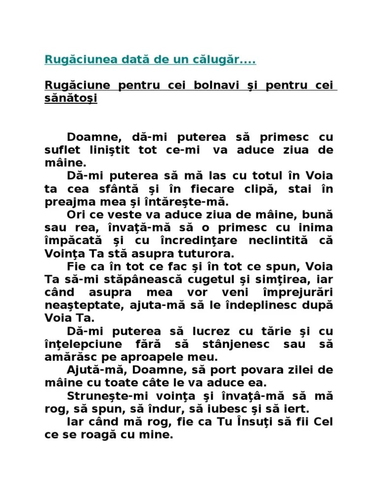 Atotputernicule doamne, tămăduitor al sufletelor și trupurilor, care cobori pe oameni și tot tu îi ridici, care pedepsești și vindeci din nou, ai mila de (numele), pentru că este bolnav (bolnavă).. 09/11/2015 · făcător de minuni încă din timpul vieţii, sfântul nectarie, ierarhul din insula eghina, născut în anul 1846, în localitatea silivria, în apropiere de constantinopol, este prăznuit pe 9 noiembrie. 15/02/2019 · rugaciune puternica pentru cazuri grave de cancer. Sfinte efrem, mare mucenice al lui hristos, ascultă acum puţina noastră rugăciune pentru robii lui dumnezeu (numele) … Articole din rugaciune cancer scrise de cristi. În numele tatălui și al fiului și al sfântului duh, amin. Trimite la adresa de email numele tău adresa ta de email anulează. Trebuie spusa de 3 ori in fiecare zi, iar atunci cand o spuneti trebuie sa credei cu ardoare ca veti fi vindecat de acesta boala.. Atotbună stăpână, sfântă maică a lui dumnezeu, pantanassa, împărăteasă a toate, nu sunt vrednic să intri sub acoperământul sufletului meu.