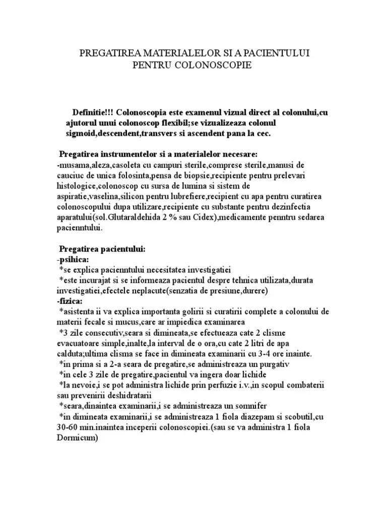 Fara o pregatire adecvata, este posibil ca examnul sa nu decurga in conditii optime si sa fie nevoie de repetarea acestuia. . Pregătirea pentru colonoscopie pregătirea pentru colonoscopie este o etapă premergătoare colonoscopiei care constă în curățarea colonului pentru ca acesta să poată fi explorat corespunzător.